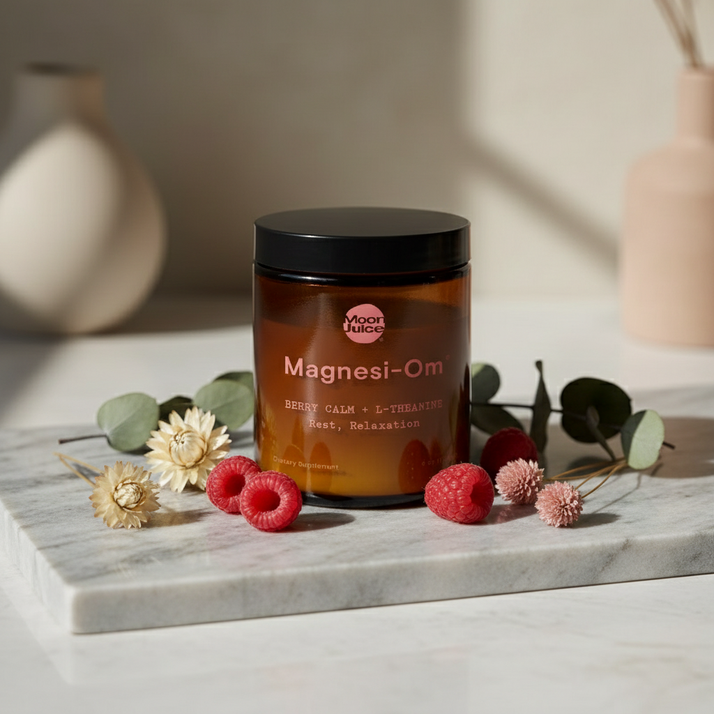 Moon Juice Magnesi-Om is a premium magnesium powder formulated to support relaxation and natural sleep quality. This berry-flavored supplement combines magnesium with L-theanine, an amino acid known for promoting calm focus. Each 4.2oz glass jar contains 30 servings of this herbal relaxant, designed to aid regularity and overall wellness. The brand's commitment to 100% traceable sourcing ensures every ingredient meets rigorous quality standards, giving you confidence in what you're consuming. Simply mix into water or your favorite beverage for an easy daily ritual that supports your body's natural relaxation response.